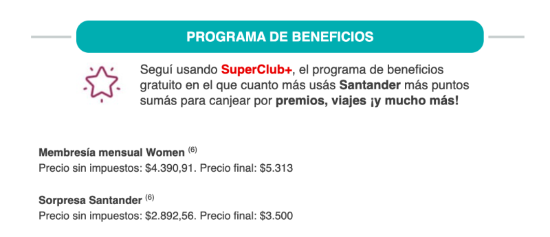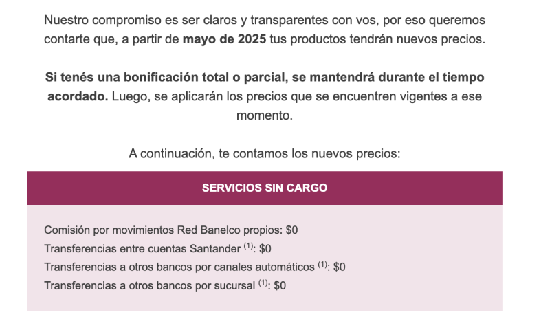 (2) Consiste en la bonificación del 100% del valor de tu paquete (“comisión por servicio de cuenta”). Para honorarios únicamente válido si el empleador es cliente del banco y paga desde una cuenta en Santander a través del módulo de pago de sueldos/honorarios y no como concepto transferencias/honorarios. Promoción válida hasta el 30/06/2025 o hasta el cese de acreditaciones de haberes u honorarios en el Banco, lo que suceda primero. En ese caso, se deberá abonar el precio actualizado vigente en dicha fecha. Renovable a opción del Banco. Te recordamos que la cuenta en que se acreditan haberes (Cuenta Sueldo) no tiene costo alguno en cuanto a su constitución, mantenimiento o extracción de fondos en todo el sistema bancario, hasta el monto derivado de las remuneraciones y/u otros conceptos derivados de naturaleza laboral, cualquiera fuera la modalidad extractiva empleada, mientras se verifique el cobro de sueldo, u honorarios y en la medida que perdure la relación laboral con el empleador, de corresponder