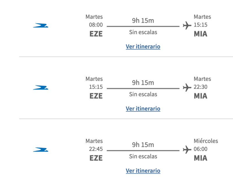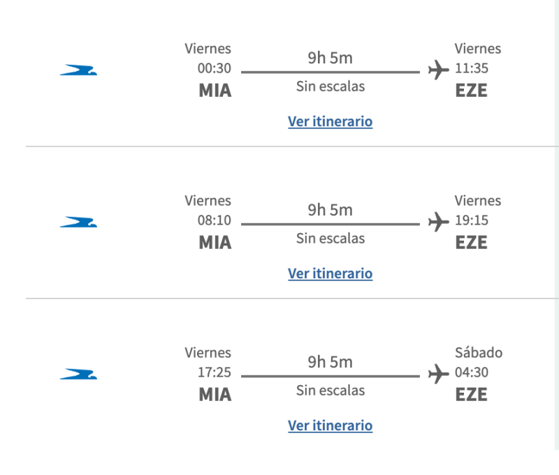 Cuando hay dos vuelos por día, es uno diurno y el otro nocturno en cada sentido, o sea cuando va a Miami de noche ese mismo avión vuelve de día. La tercera frecuencia marcan que saldrá en el verano a las 15:15 por lo que llega como 22:30. Parece un horario medio feo… pero permite seguramente una entrada más ágil en migraciones de Miami.