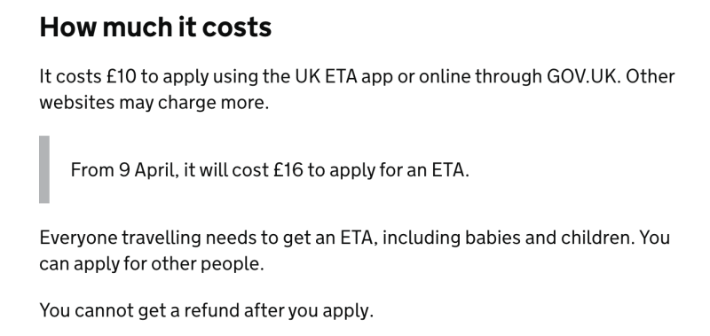 Si vas a viajar al Reino Unido en pocos meses, te conviene quizás hacer ahora el ETA al precio «viejo» de 10 libras. Desde el miércoles 9 de abril pasará a costar 16 libras.