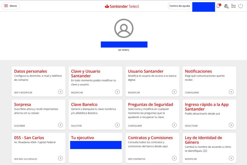 Pero básicamente es en el home banking, no en la app por ahora, y entrando en el nombre de uno arriba a la derecha se llega a este panel donde hay que ir a NOTIFICACIONES