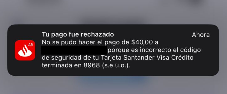 Hola Sir. Gracias a los avisos de gastos del Santander, al toque pude pausar la Visa y desconocer un gasto. Soy de las que piden el PostNet y no entrega la tarjeta, todavía no entiendo cómo hackean las tarjetas!!.