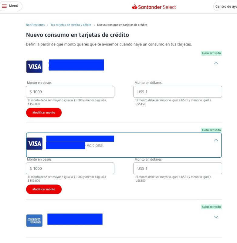 Algo que se modificó ahora en Santander, es que ya no acepta el sistema de mensajes de Visa Home. A mi me pasó que tuve que dar de baja un plástico porque me habían robado los datos y la tarjeta nueva ya no pude configurarla desde Visa home y me avisó que tenía que hacerlo desde el Banco. La adicional de mi esposa, que la tenía ingresada desde antes, me sigue mandando los dos mensajes el de Visa y el del Banco.