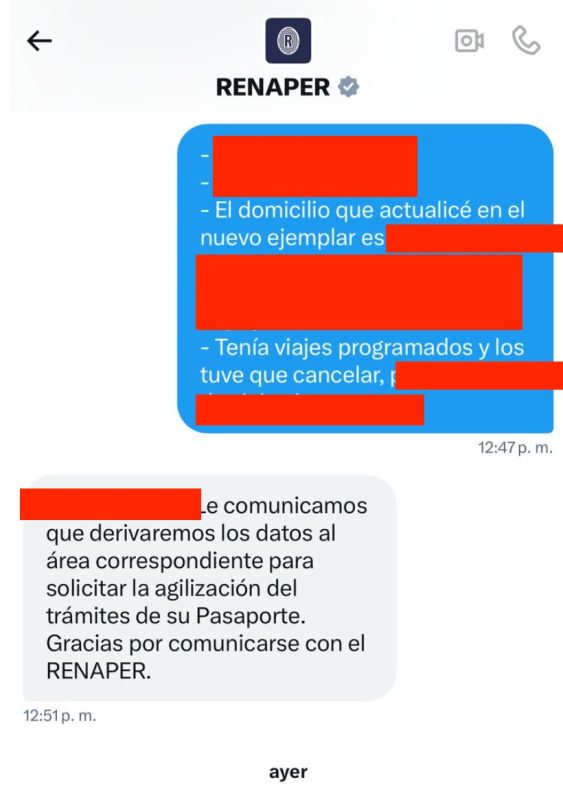 Sir, actualización de estado: Luego de esperar los días que me indicaron que iba a tardar en llegar a casa cuando fui a hacerle el pasaporte común a mi hija (o sea, respetando los tiempos estipulados por ellos, sin que me gane la ansiedad aunque los tiempos ya vayan apretando) finalmente ayer a las 14:00 hs les escribí por X e Instagram a la gente de RENAPER…. y me respondieron por ambas redes a las 17:00 hs!!! Rapidísimo: Por Instagram: «Hola. Le informamos que hemos solicitado la agilización de su tramite. Gracias por comunicarse con Renaper.» y por X: «Hola. Tomaron el reclamo via Instagram el dia de hoy. El reclamo se encuentra en curso, ya fue solicitada la agilizacion. Gracias por comunicarte con el Renaper»