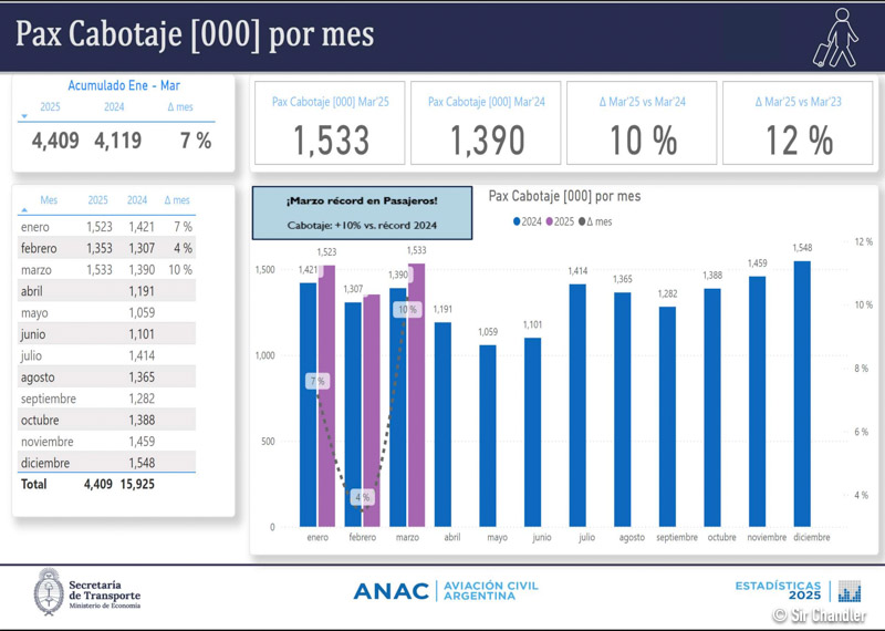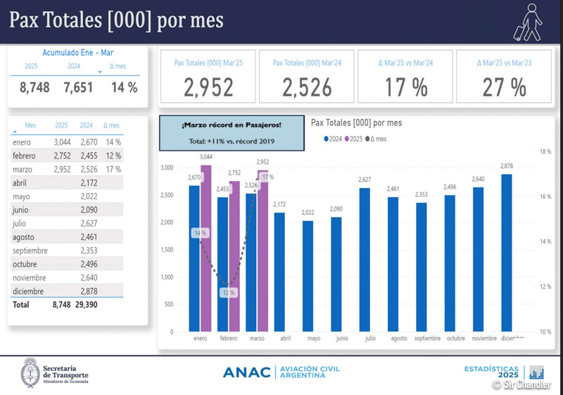 Hoy la ANAC sacó sus clásicos reportes sobre el movimiento de pasajeros y aviones en todo el país del mes anterior, en este caso Marzo 2025. por lo que procedo a mostrar y analizar algunos de los cuadros