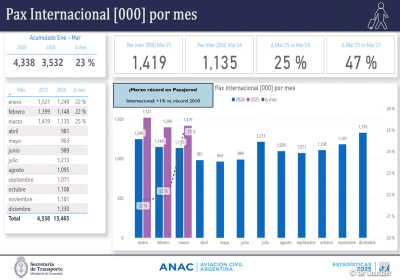 En internacional el crecimiento es superior. Hubo 1,4 millones de pasajeros, un 25% más que hacde un año y un 47% más que hace dos. Y contra 2019 la mejora es casi del 7%. Entonces ahí marcan que fue el mejor marzo de la historia porque lo comparan con marzo 2018 con una mejora del 1% en ese caso.