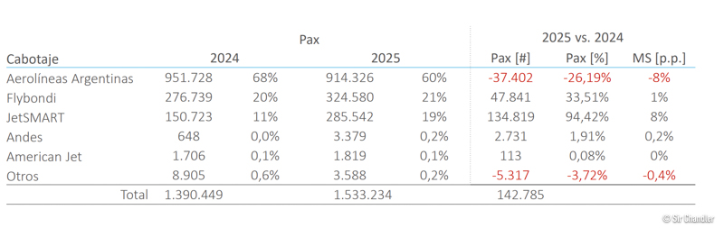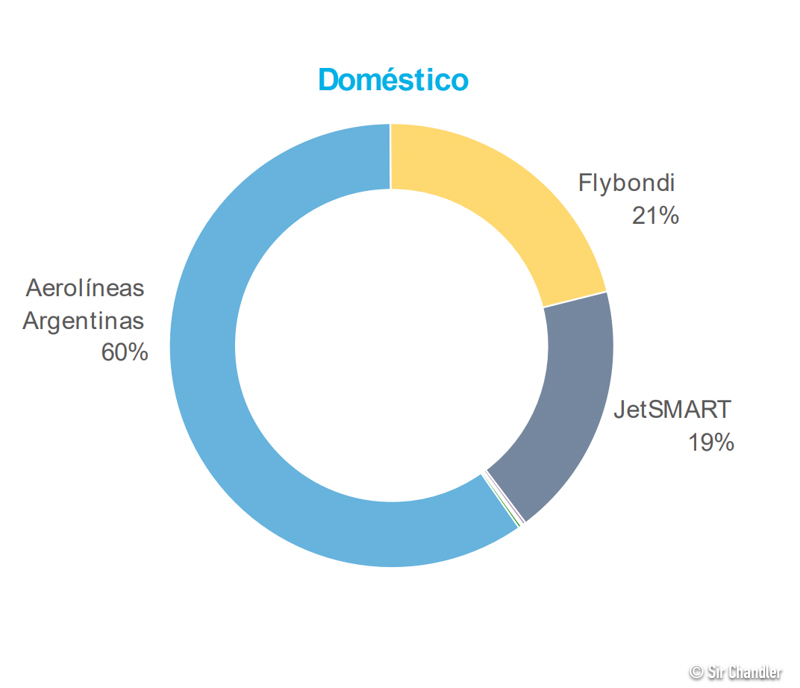 Flybondi con el refuerzo de aviones que tuvo creció con casi 48.000 pasajeros ganó un punto en la participación. Jetsmart con la suma de aviones, tres de ellos Airbus 321 mejoró casi 135.000 pasajeros lo que le llevó a ganar 8 puntos de la torta