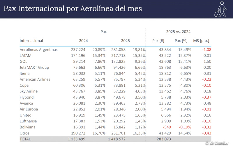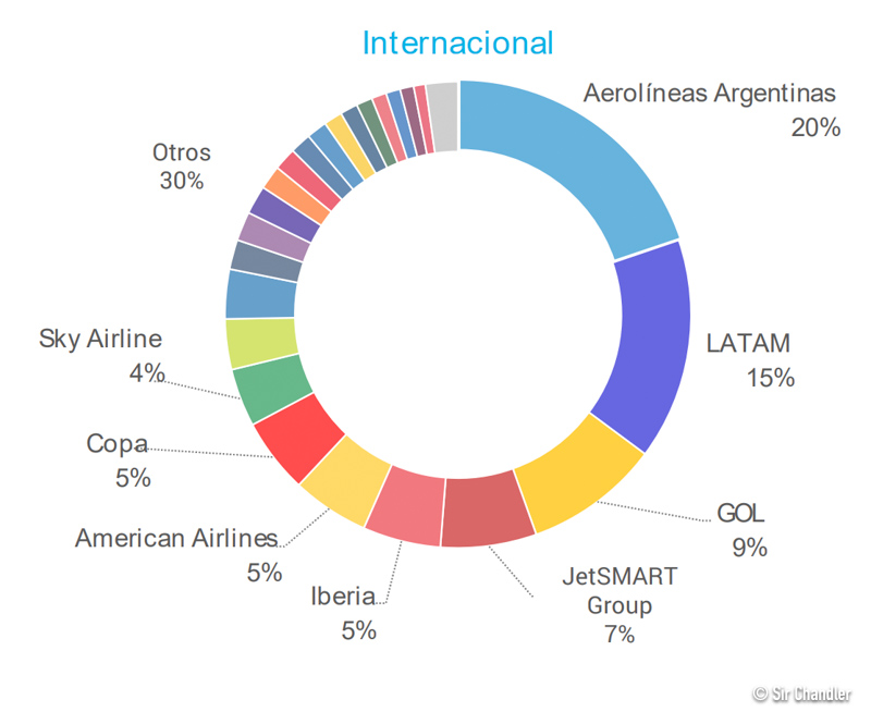 En el cuadro internacional se ve que Aerolíneas tuvo casi 44.000 pasajeros más y fue la que más creció, pero cerca quedaron GOL y Latam en ese crecimiento. Igualmente AR perdió un punto de la torta. Gol es la que más creció con un punto y medio.