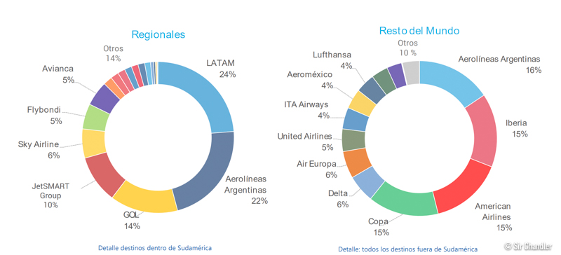 Pero si separamos en REGIONAL gana LATAM y en RESTO DEL MUNDO podemos ver como Iberia, American y Copa quedan a un punto de Aerolíneas. Estimo que en los próximos meses subirá Copa con los vuelos nuevos, pero además American bajó vuelos a fines de marzo como es habitual, entonces también pierde. No sería ese caso el de Iberia que mantiene sus 3 diarios a Madrid.