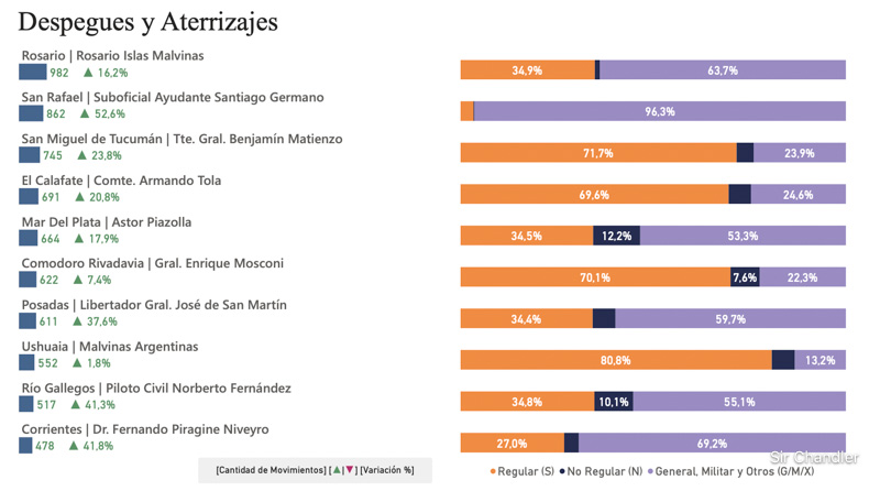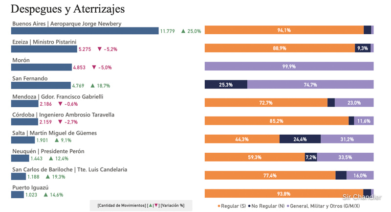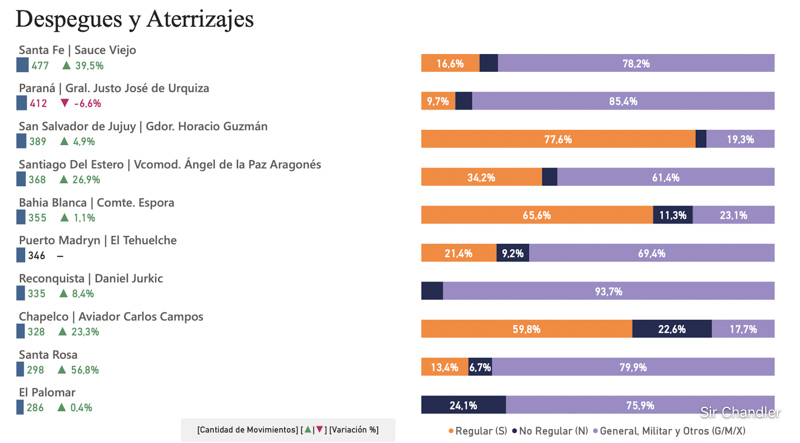 Ahora si vemos el ranking de Despegues y aterrizajes se ve la composición de las operaciones de cada aeropuerto. Porque Morón es el tercer aeropuerto con más movimiento del país… siendo un 99,9% de operaciones de la aviación general. Esto es porque ahí hay muchas escuelas de vuelo. San Fernando tiene también varias, pero ahí ya aparecen los corporativos que los ponen como «no regular»