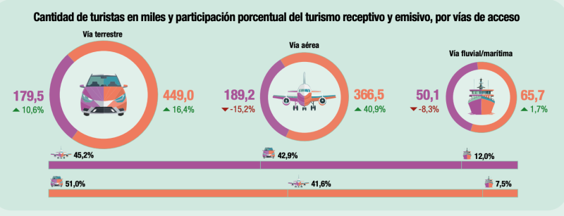 La suma de turistas y excursionistas es lo que INDEC llama VISITANTES. Y aparte también tiene a los VIAJES TURISTICOS, pero en los dos casos se da lo de por cada persona que entra salen dos.