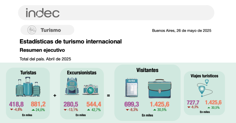 Y ahí en los % se ve que turistas que ingresaron bajó un 4,8% en relación a abril 2024 y los que salieron creció un 24%. En cuanto a los excursionistas la diferencia es mayor porque los que salieron, seguramente de compras por un día, crecieron un 42,7%