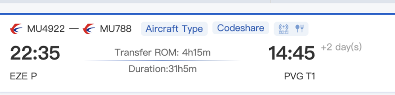 Hoy si se busca en el sitio de China Eastern y uno quiere volar a Shanghai, combina con Aerolíneas Argentinas en Roma