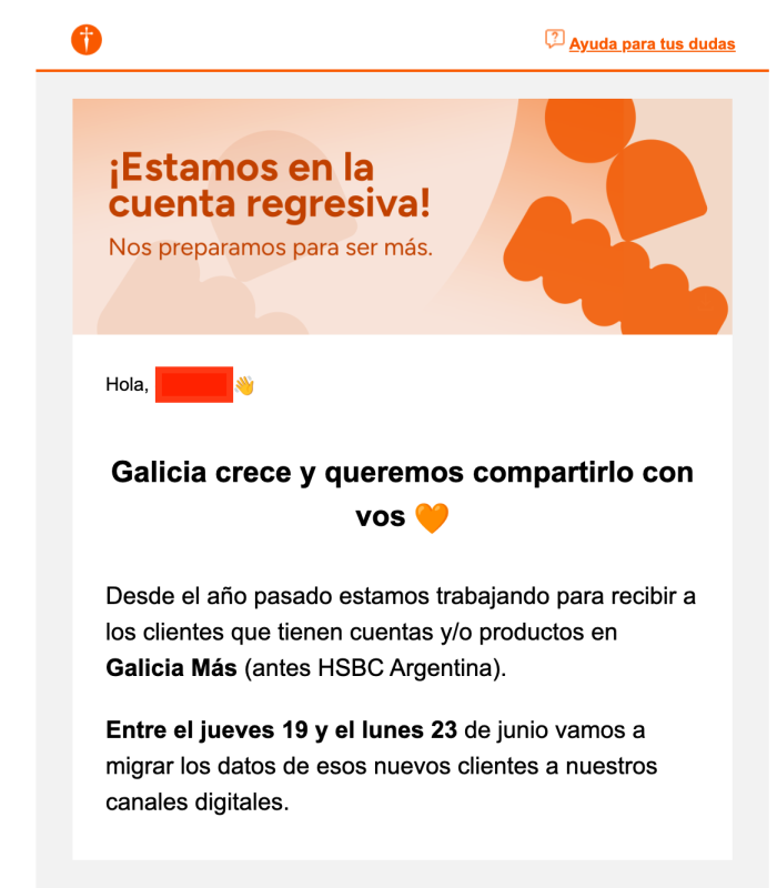 Buenas! En mi experiencia si bien venian mandando mail que bajemos la app de galicia y hagamos las claves, el tema que estos días ibamos a estar sin servicio no lo avisaron con anticipación. Por mail no me llego nada y de casualidad me entero el miércoles en la app de galicia mas porque justo entre a ver algo. Si asi ya empezamos… en fin.