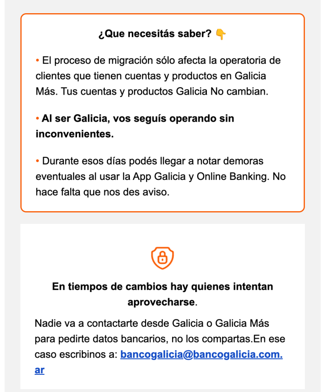 Igual aclaran por eso que «vos seguís operando normalmente»… quizás no hacía falta mandar el mail, porque alguno estará atento. Salvo con eso de que la app y el HB pueden estar lentos… CHAN (que sinceramente no es de fallar el Galicia HASTA AHORA con eso)