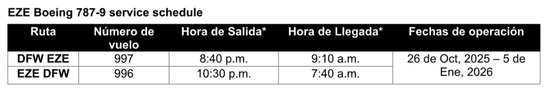 La aerolínea continuará operando su ruta DFW-EZE hasta el 28 de marzo de 2026, con un Boeing 777-200. Durante la temporada de verano, la aerolínea operará hasta 42 vuelos semanales desde EZE a tres centros de conexiones en EE. UU., incluyendo cuatro vuelos diarios a Miami (MIA) y servicio diario a Nueva York (JFK) y DFW.