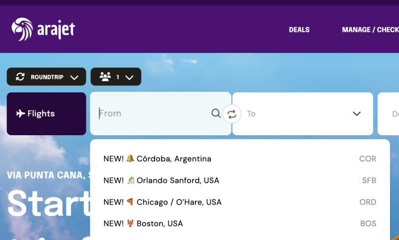 Así aparece destacado en el buscador del sitio de Arajet https://new.arajet.com/es-us/home