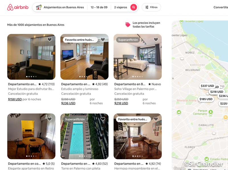 Entonces hice una búsqueda en Buenos Aires y como me muestra «más de 1.000 alojamientos» no me sirve para ver el número real.