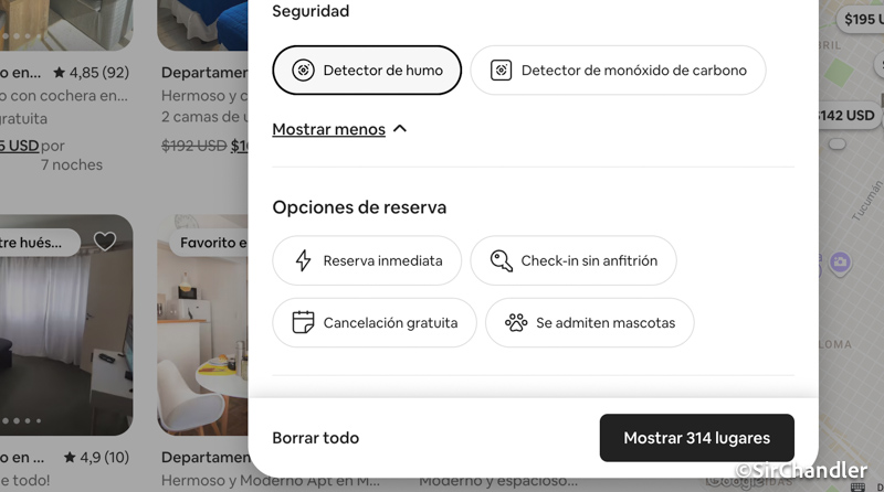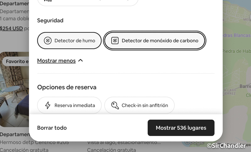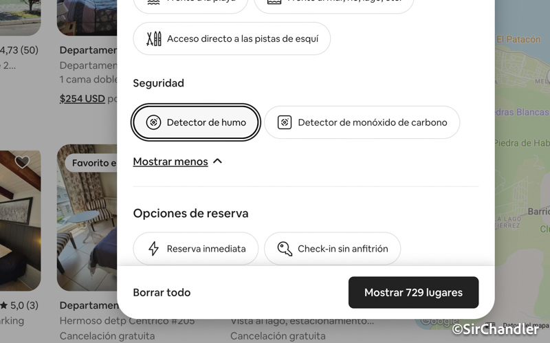 Si buscamos en Bariloche también tenemos más de 1.000 alojamientos. Y quizás por mayor cantidad de construcciones de madera o por el uso mayor en el año de calefacción ahí podemos filtrar que hay 729 alojamientos con detector de humo