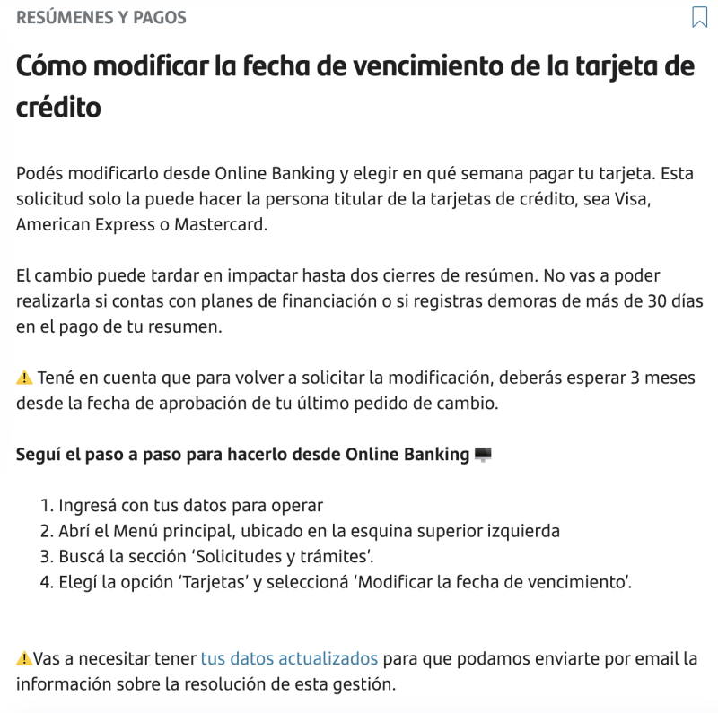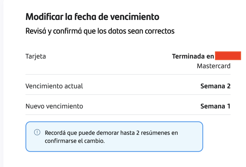 Algo que tienen muchos bancos, ahora de manera online, es permitir modificar las fechas de cierre y por lo tanto de vencimiento de las tarjetas. Esto es útil para poder tener dentro de un mismo banco dos ciclos distintos. O si uno trabaja con más de un banco tener diferenciados los cierres.