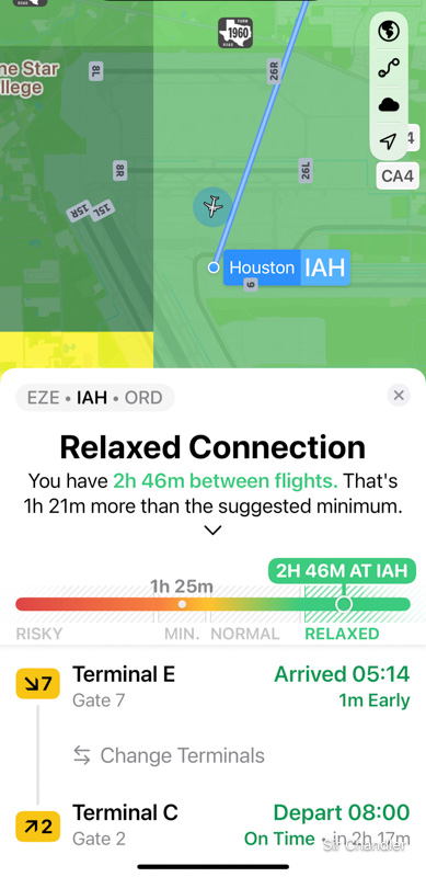 Mi conexión en tiempo normal había sido generosa en tiempo, algo que yo había buscado, pero en la app FLIGHTY me indicaba que para Houston el tiempo normal es de 1:25, como tenía yo 2:46 estaba 1:21 por encima y era conexión relajada.