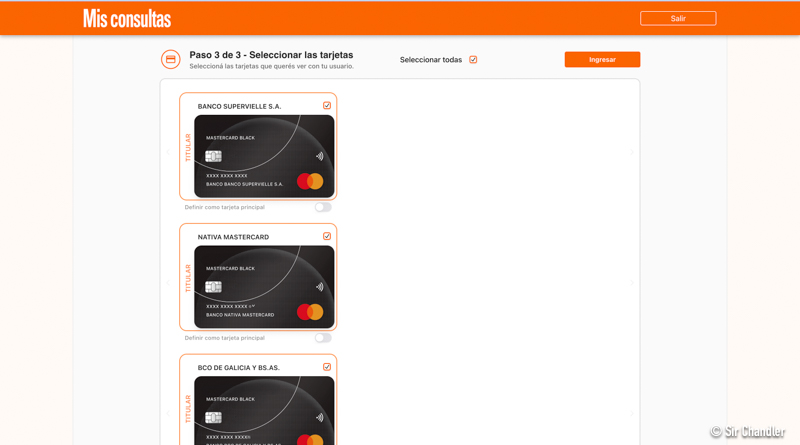 Eso se validará con mail y con SMS. Luego con todo ok entrarán al sitio y verán sus MASTERCARD de los bancos que trabajan con MIS CONSULTAS (o FISERV que tiene los autorizadores CLOVER). Incluso las tarjetas que dieron de baja en los últimos cinco años, como es mi caso de la NATIVA del Banco Nación que se ve en esta imagen