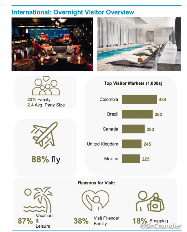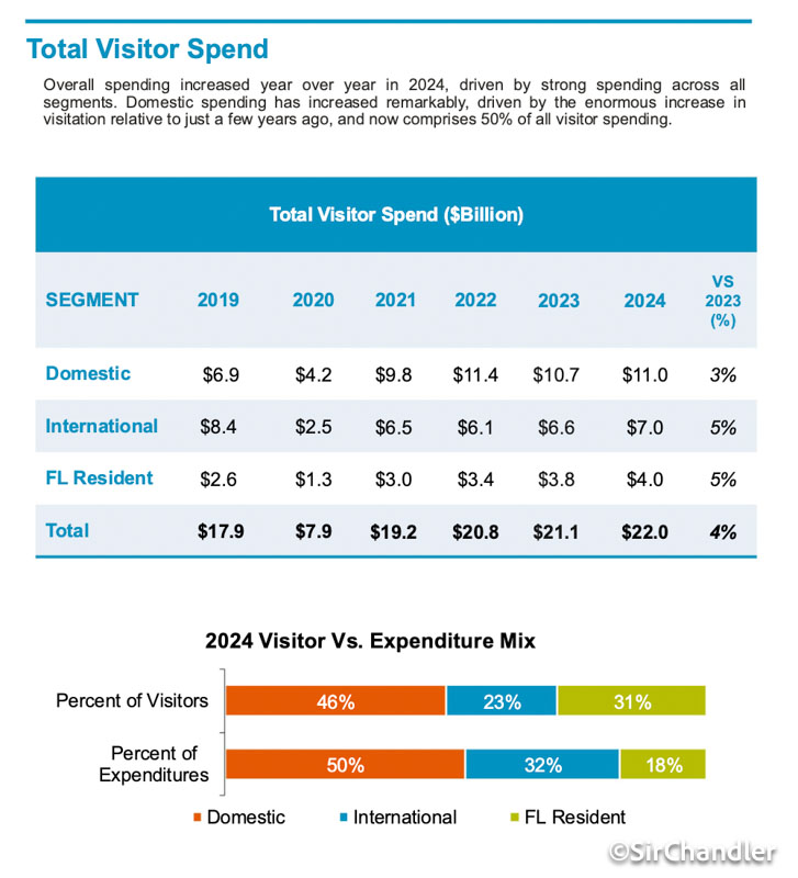 Y este cuadro parte los ingresos entre visitantes de Estados Unidos, los internacionales y los RESIDENTES en el estado de Florida. Y el gasto de los extranjeros es proporcionalmente superior al de los «locales». Se ve que con el 23% de los que entran pero el 32% de los que gastan. A ver, un residente en Florida va con su propio auto o uno de fuera de Florida no necesita hacer compras mayormente… de ahí la diferencia lógica a favor de los viajeros internacionales