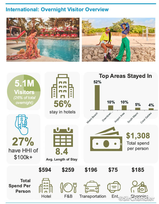 ¿donde se quedan? ¿Cuanto gastan? 1.308 dólares en promedio gasta cada persona… se quedan en promedio 8,4 noches y el 56% lo hace en hoteles. Mayormente, el 52% lo hace en Miami Beach (de nuevo, no cuenta áreas fuera del condado de Miami)