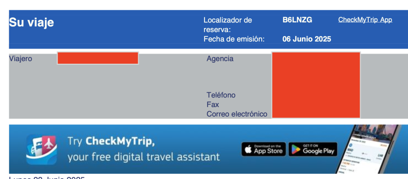 Acá en una agencia que usa AMADEUS (no necesitan saber eso, pero lo comento porque aparece lo de CHECK MY TRIP que es de ellos). Arriba vemos el LOCALIZADOR DE RESERVA con un código