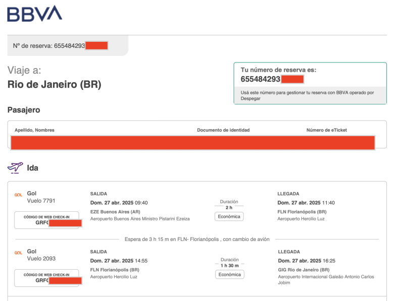El programa de millas del BBVA usa a Despegar, entonces te mandan un número de reserva que es de ellos y junto al vuelo está el «código del web checkin» que es el código de la aerolínea disfrazado con un nombre más amigable para quien no conoce el término (y está bien)