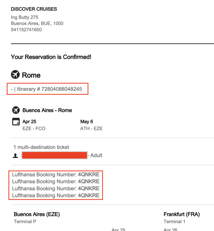 Una agencia puede tener un formato diferente… mandarte el texto de que está confirmado con un código propio como se ve acá con ITINERARY y luego más abajo ver el BOOKING NUMBER