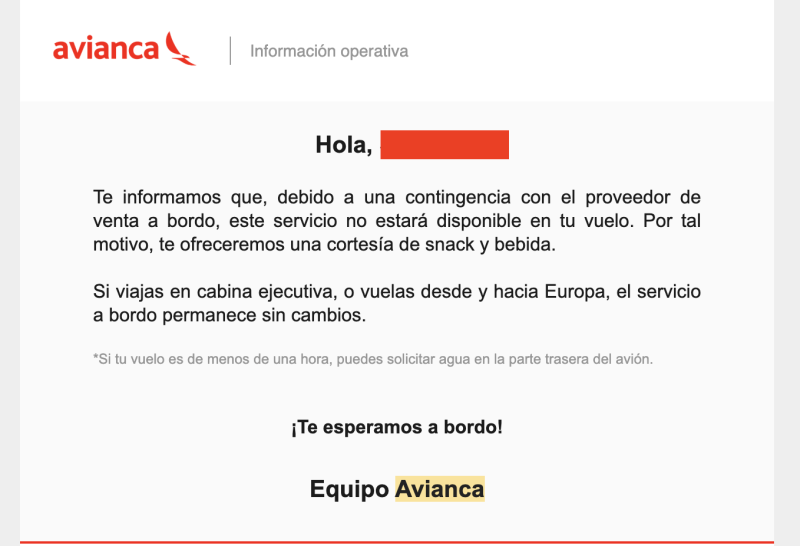 El día anterior recibí mensaje de que en mi vuelo por «problemas con el proveedor de venta a bordo» no estaría disponible la venta entonces darían un SNACK Y BEBIDA DE CORTESIA.