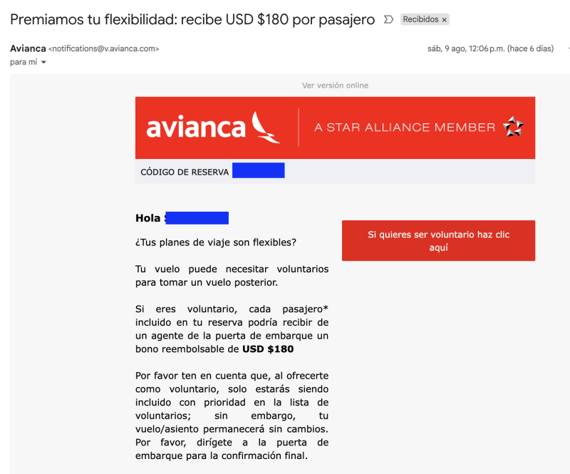 Avianca me decía que me premiaban con USD 180 si me pasaba a un vuelo posterior