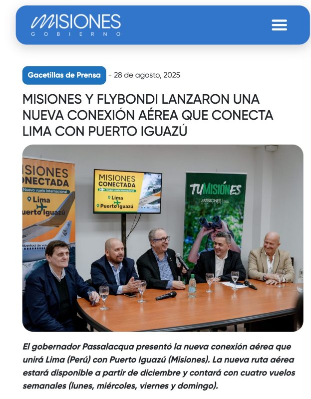 POSADAS, JUEVES 28 DE AGOSTO DE 2025. Esta mañana, el gobernador de Misiones, Hugo Passalacqua y el CEO de Flybondi, Mauricio Sana, lanzaron la puesta en marcha de una nueva ruta aérea internacional que unirá Lima (Perú) con Puerto Iguazú (Misiones). Se trata de un vuelo directo operado por Flybondi, que comenzará a funcionar en diciembre de 2025. Esta nueva línea tendrá una frecuencia de cuatro vuelos semanales: lunes, miércoles, viernes y domingo y la venta de pasajes se habilitará oficialmente durante la primera semana de septiembre.
