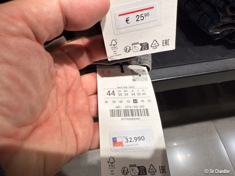 Que no me acuerdo en cual de las dos tomé esta foto donde se ven los precios en Europa que luego son etiquetados en Chile. O sea es la misma ropa
