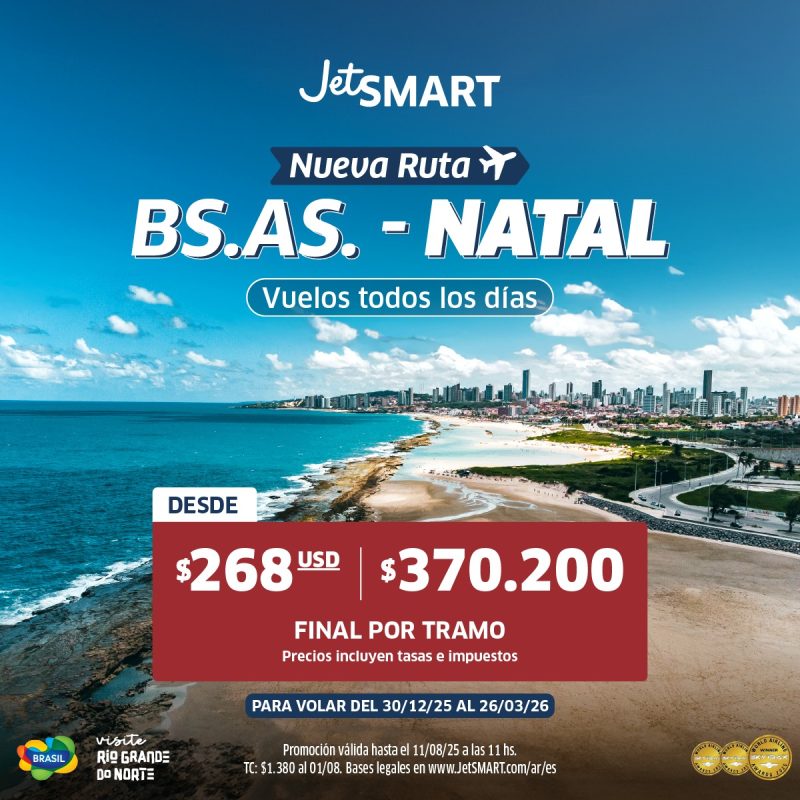 Buenos Aires, 5 de agosto de 2025. JetSMART, la aerolínea ultra low cost de mayor crecimiento y con la flota más grande y moderna de Sudamérica, anuncia el inicio de ventas para su nueva ruta internacional entre Buenos Aires y Natal, Brasil, un destino muy valorado por sus playas. Esta nueva conexión directa comenzará a operar el 30 de diciembre y contará con siete vuelos semanales, de lunes a domingo.