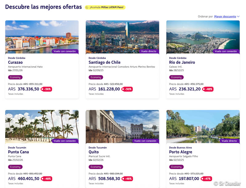 Hola Sir estoy pensando en ir a Chile en octubre la verdad no son ofertas, los vuelos más baratos siempre son en horarios incomodos por ejemplo salir a las 3 de la mañana para llegar a Santiago a las 5:30 ¿y qu3e haría desde esa hora hasta las 15 h. que es el check-in de cualquier alojamiento? Esto siempre es un tema. Y si vas al sitio de Estados Unidos tenes los vuelos mas convenientes en horario y en precio aunque es en dolares si haces la cuenta te das cuenta que no hay oferta válida por todo lo que comento. Esto lo vengo viendo desde hace ya un tiempo siempre es así, te ponen en oferta los vuelos que nadie quiere. Lo mismo pasa con los vuelos directos cualquier lado pero pongamos a USA ¿que hago si llego a las 5,30 a Los Angeles por ejemplo si el check-in es a la tarde y no tenes donde dejar el equipaje. O en el regreso si el vuelo es a las 23 h y mi check-out del alojamiento es a las 12 h. estamos hablando de vuelos directos LATAM. ¡Es un tema…! Saludos