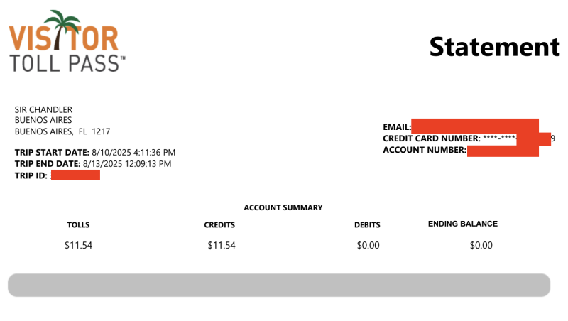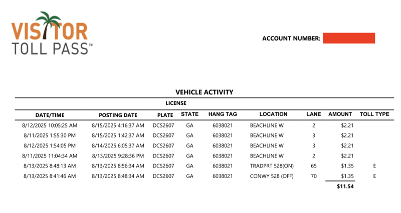 Y vin el detalle de los peajes que usé. Gasté un total de USD 11.54 en los tres días