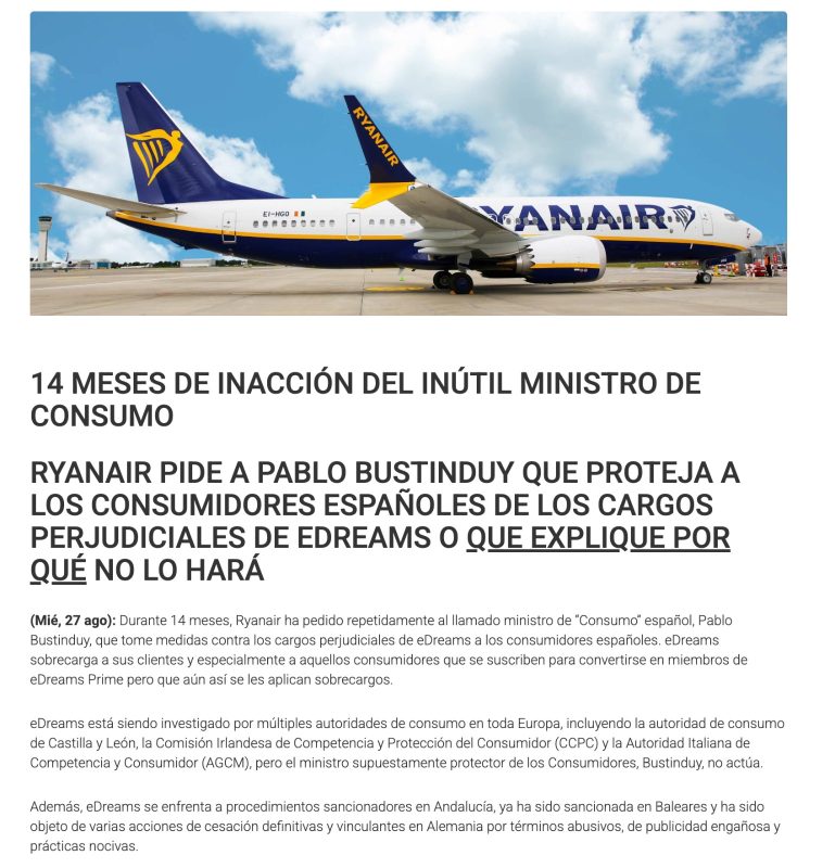Y meto en el medio algo particular de Ryanair (algo más) buscando la info oficial para esta nota me encontré con un comunicado de Ryanair donde creo que se queja un poco de un ministro español… como ya lo hizo con autoridades de Francia y otros lados.