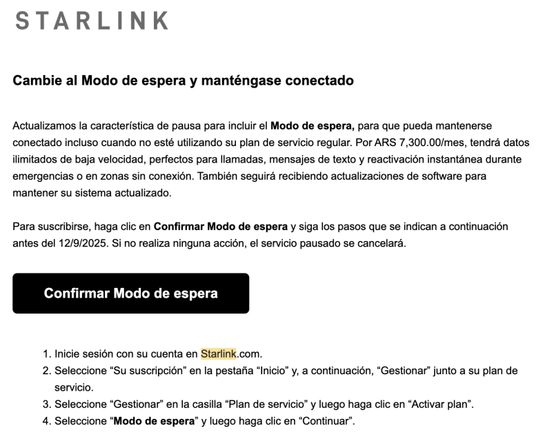 Algo raro llegó hace unos días en las cuenta de Starlink. Se terminará el pausado del abono sin cargo para pasar a tener un sistema de «modo de espera» o «stand by».