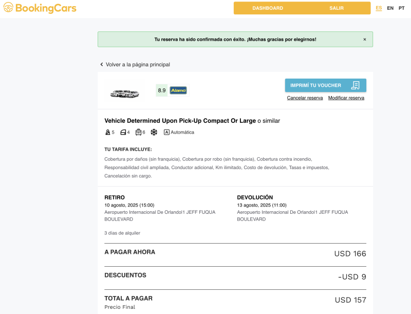 En el pago final decía el «vehículo a determinar en el retiro», amén de que con Alamo uno elige dentro de una categoría, pero acá me decía que eran dos categorías o similares. También se ve el descuento aplicado con el código del blog