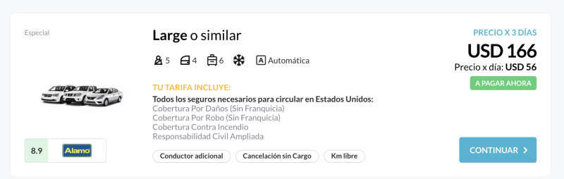 Alquilé un auto para estar tres días en Orlando y en las opciones había una que lo decía de manera distinta. Metía un «largo o similar» como categoría. Cuando normalmente te dice TAL MODELO DE AUTO.