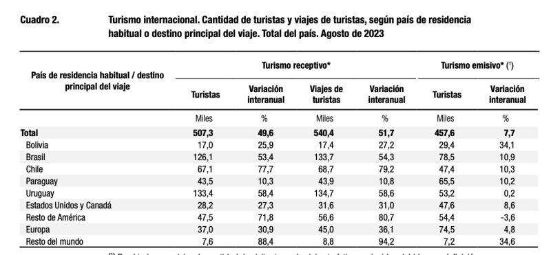 Pasé todo a un excel y puse los números de salida de los argentinos en cada agosto. Y el total de agosto 2025 indicó que casi 800.000 argentinos salieron, esto incluye a los que se van en avión, en micro, en ferry y en auto… sea por varios días o por pocas horas. Están todos acá adentro como informa el reporte de INDEC. Por eso quien cruza a Encarnación del Paraguay es un turista emisivo, por más que se haya ido a comprar un termo Stanley parecido 😛