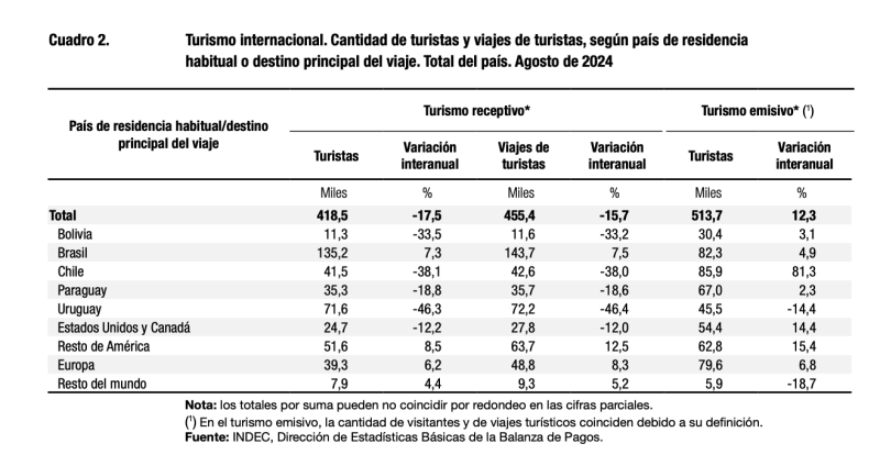 Este es el cuadro de este agosto 2025 con el destino de los argentinos, donde Brasil ganó por mucho y en un año DUPLICÓ la cantidad de argentinos que recibió. Al mismo tiempo ellos bajaron un 13% en las entradas a la Argentina lo cual no es tan terrible se podría decir, porque la temporada de invierno fue mala y podría haber sido peor.
