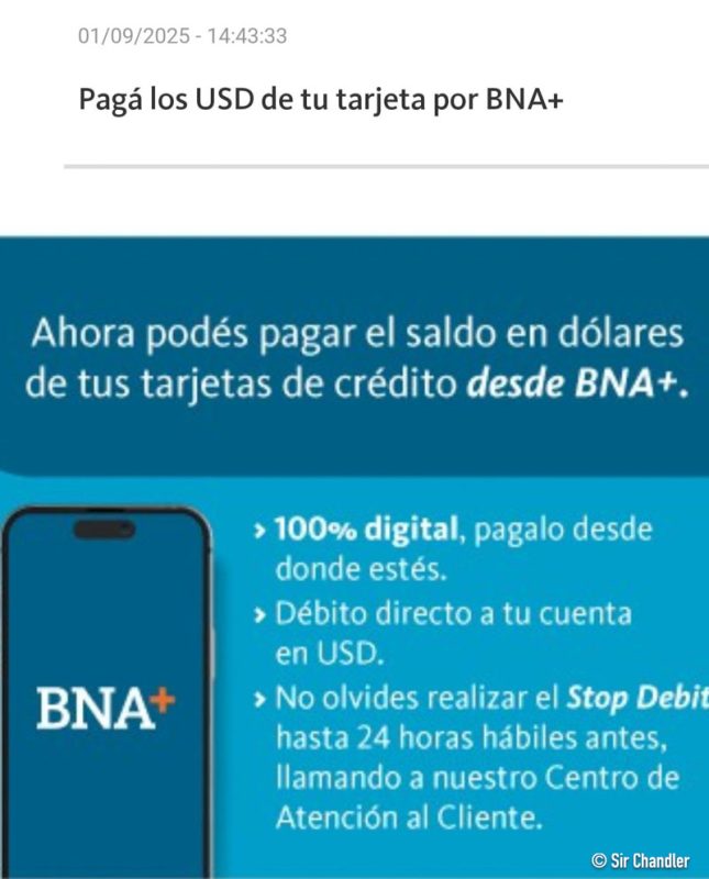 Ayer llego a ultima hora un email que explica que desde la app de BNA+ usando la agenda de pago de servicios, podes pagar los dólares haciendo stop debit desde allí, sin necesidad de llamar por teléfono. Es mi segundo mensaje, ya que en anterior te habia pasado un link de la imagen del email donde explica todo, subida a un drive, pero no lei bien y me lo elimino.