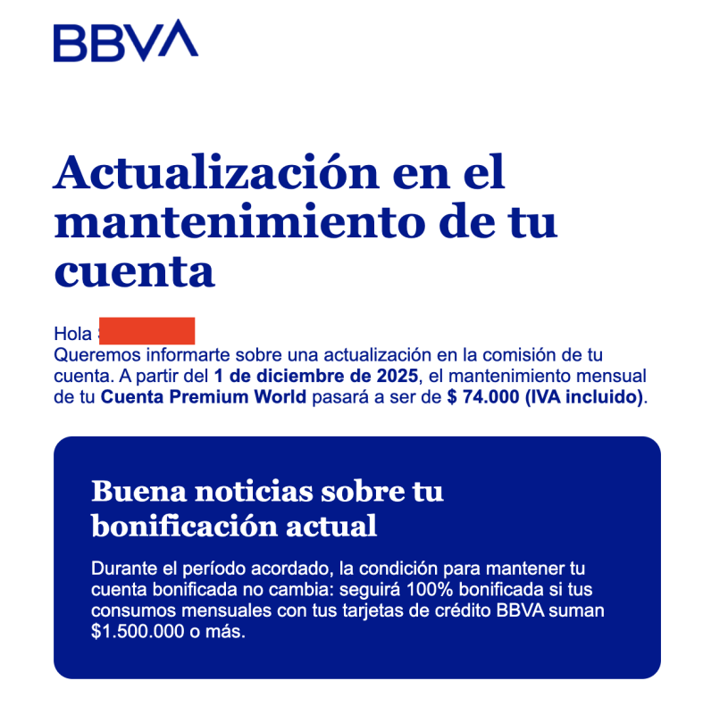 A mi llegó hoy.. A partir del 1 de diciembre de 2025, el mantenimiento mensual de tu Cuenta Premium World pasará a ser de $ 74.000 (IVA incluido). La tengo bonificada por unos meses más. Si no se puede mantener con transferencias, nos vemos BBVA.
