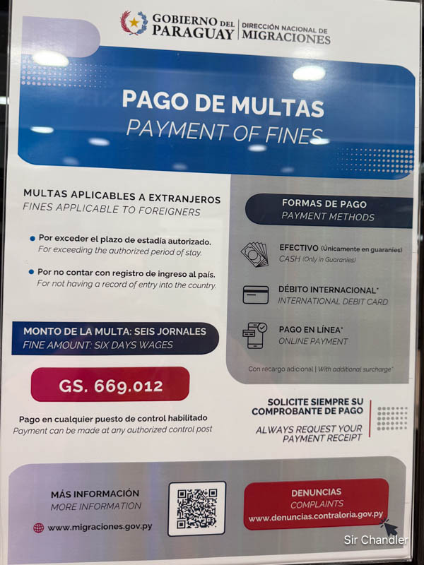 O sea cuando vuelva tendré que pagar esa multa, que según el sitio SOLO SE PUEDE ABONAR EN EFECTIVO Y CON GUARANIES (???) en el aeropuerto, pero el papel pegado dice que con débito internacional también. O se paga online con las comisiones de las tarjetas de crédito.
