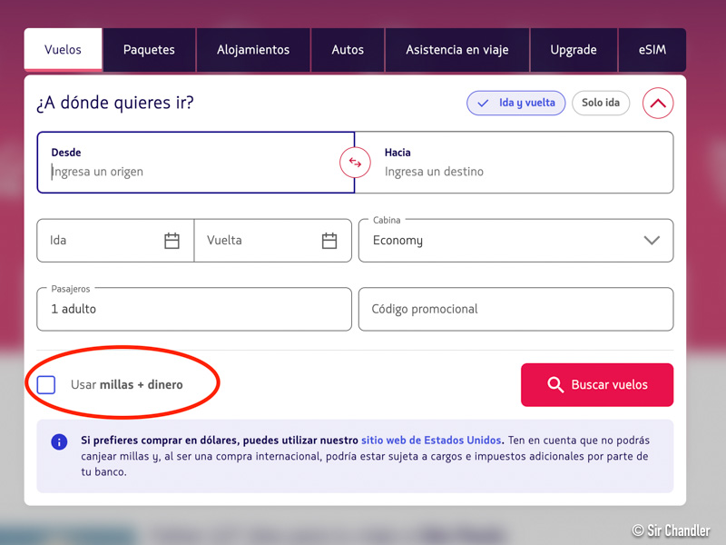 Canje total con millas + pago de impuestos, o combinación de millas + dinero (es lo que muestro arriba)