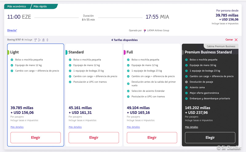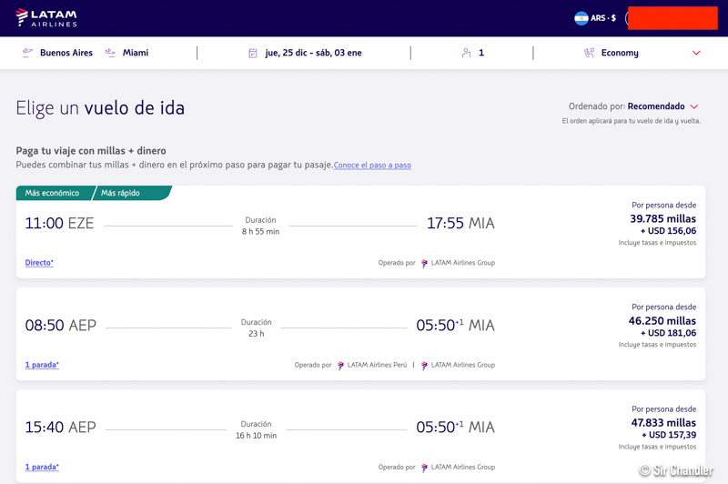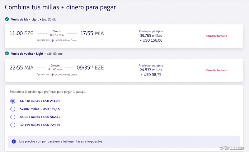 Y al final da el costo total con la cantidad de millas y dinero que se quiera poner. Esto por ejemplo para el vuelo directo de Latam a Miami que arranca en diciembre