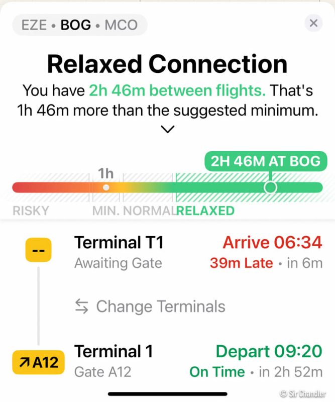 Acá lo que me decía Flighty de que llegué con 39 minutos de demora y que lo mínimo recomendado es de UNA HORA para combinar en El Dorado. O sea a mi me sobraba porque tenía 2:46