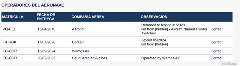 Por lo que fui a ver a Airfleet y saltó que en febrero comenzó a volar para Saudi, pero siempre siendo parte de Wamos, como parte de lo que mencionaba arriba del alquiler completo que hacen. De paso, un avión de 15 años que arrancó volando para Aeroflot